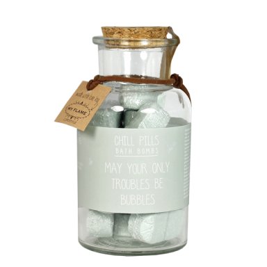 16 bruisballen, of eigenlijk chill pills in een glazen pot. Deze bruisballen lijken op een grote vitamine pil. Neem jouw welverdiende me-time en ontspan met deze heerlijke chill pills. Laat 1, 2 of zelfs 3 pillen in het badwater vallen. De pillen zullen meteen gaan bruisen en oplossen in het water.