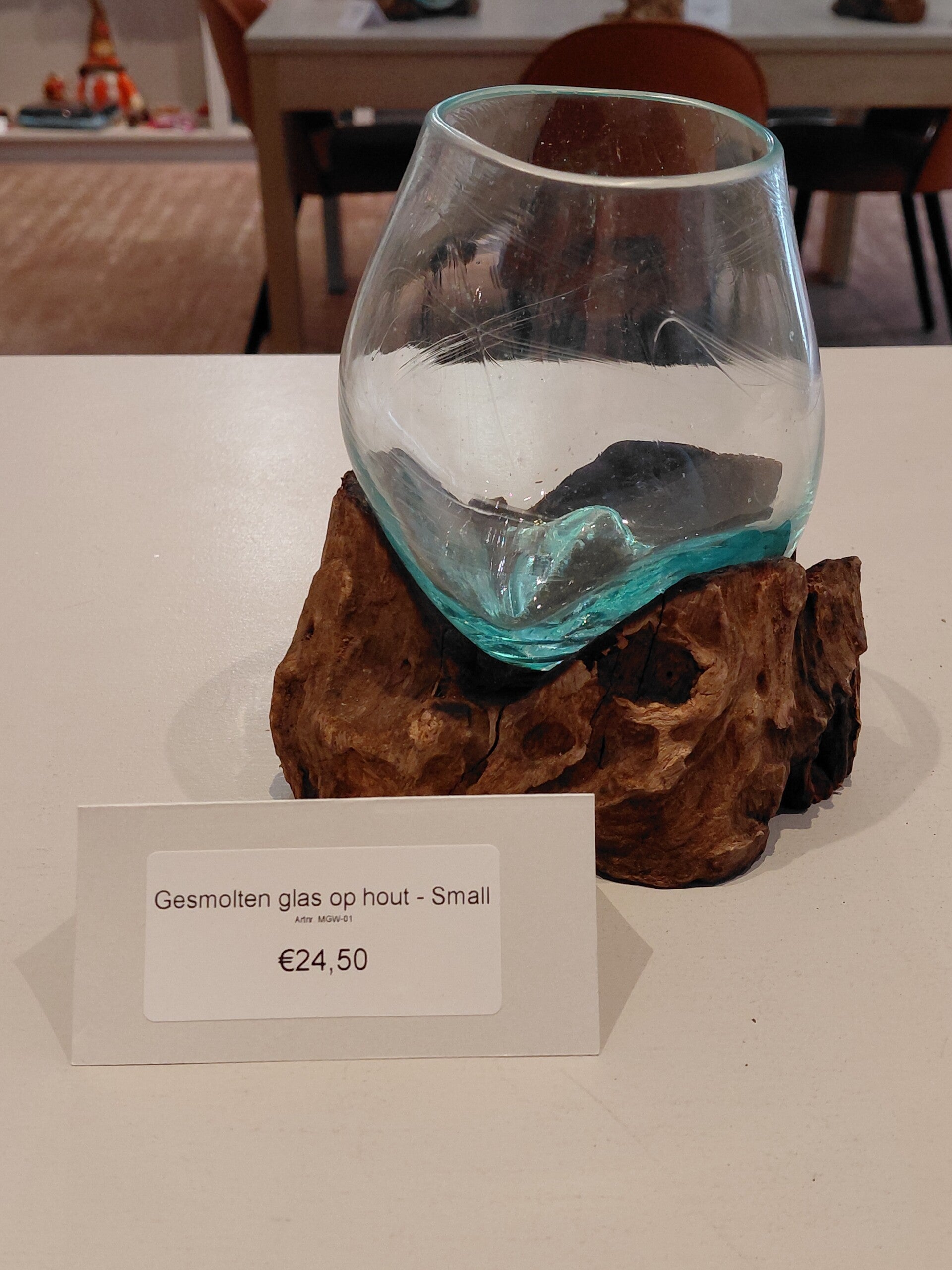 Deze prachtige kleine kom van gesmolten glas op hout is handgemaakt in Bali van gerecycled glas en Balinees Gamal-hout. Het combineert het beste van twee werelden: natuurlijk en door de mens gemaakt; aards en chic; praktisch en spiritueel. Het glas wordt met de hand geblazen en, terwijl het nog heet is, over een stuk Gamal-wortel gelegd. Het glas hardt vervolgens uit en neemt de vorm van het hout aan, waardoor een perfecte pasvorm gegarandeerd is.